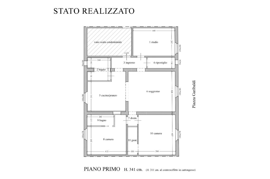 L’abitazione si sviluppa interamente al primo piano e si apre su un comodo disimpegno. A sinistra troviamo una ampia stanza con affaccio sulla piazza, ideale come camera matrimoniale oppure studio, adiacente a un pratico ripostiglio/dispensa.