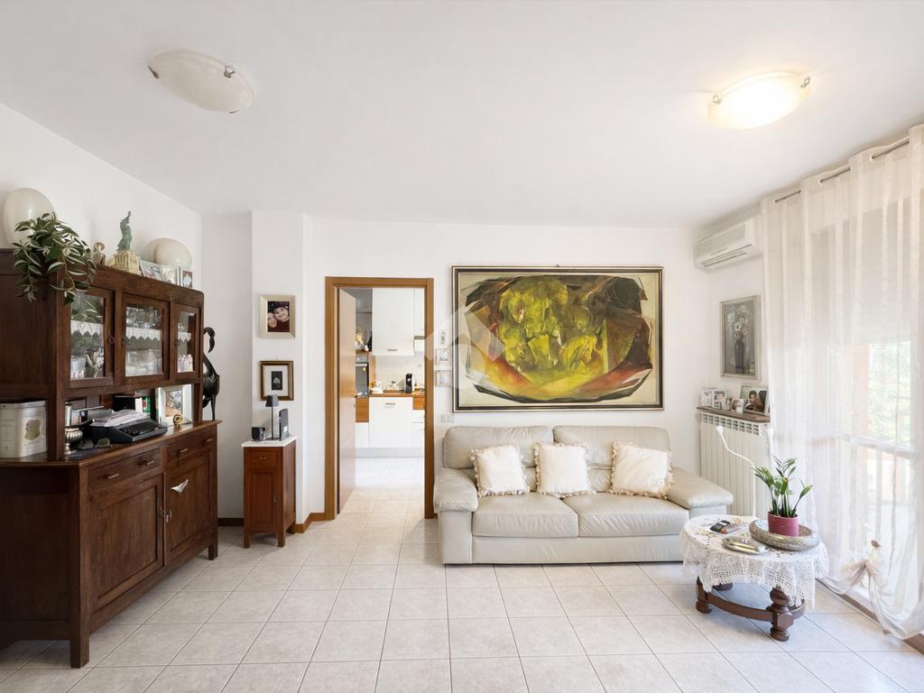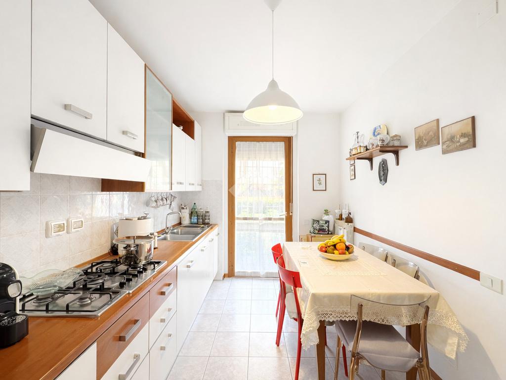 L’ingresso si apre su una luminosa zona giorno, ben organizzata e funzionale, composta da una cucina abitabile, separata dalla sala, garantendo così una netta distinzione tra gli ambienti e un’ottima vivibilità quotidiana.