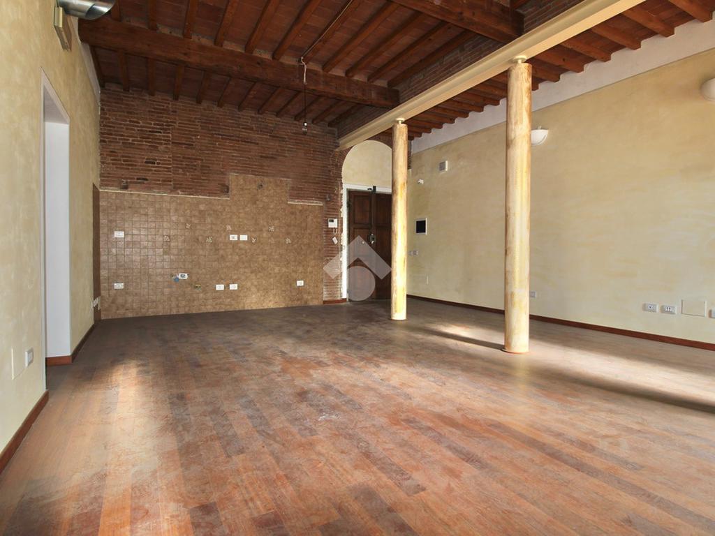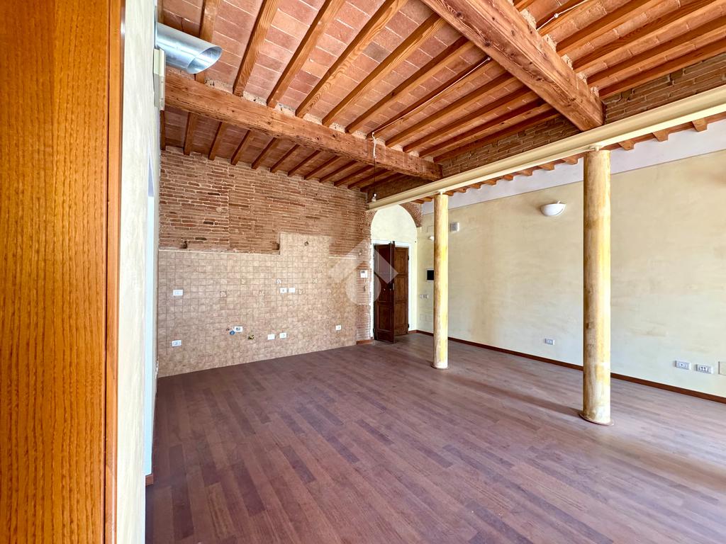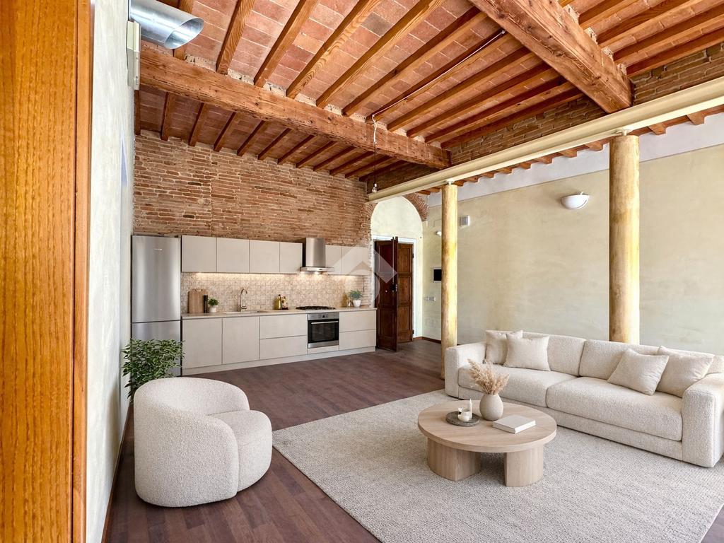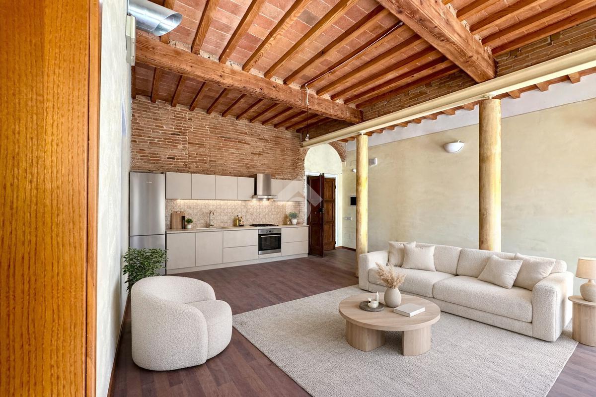 L’ingresso si apre su una splendida zona giorno open space di grande metratura, impreziosita da soffitti alti con travi e mezzane a vista e suggestivi dettagli in mattoni, che conferiscono calore e autenticità agli spazi. La presenza di colonne decorative rende l’ambiente ancora più scenografico e ideale per soluzioni di arredo moderne o di design.